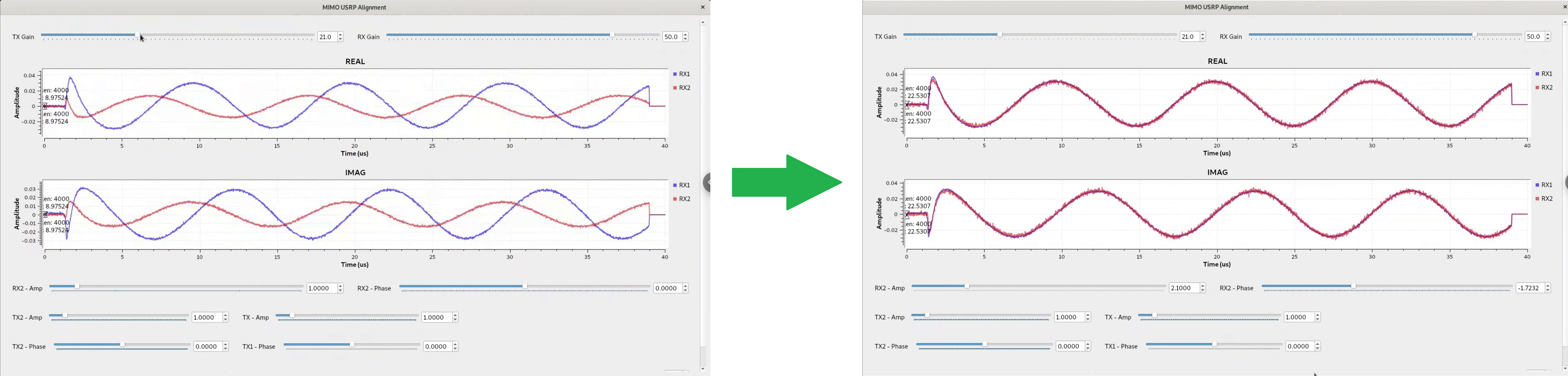 Execute the flowgraph, set the TX Gain to 20dB and adjust the following parameters until waveforms are aligned: