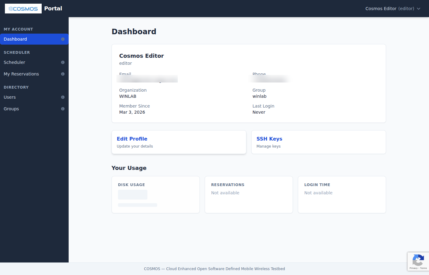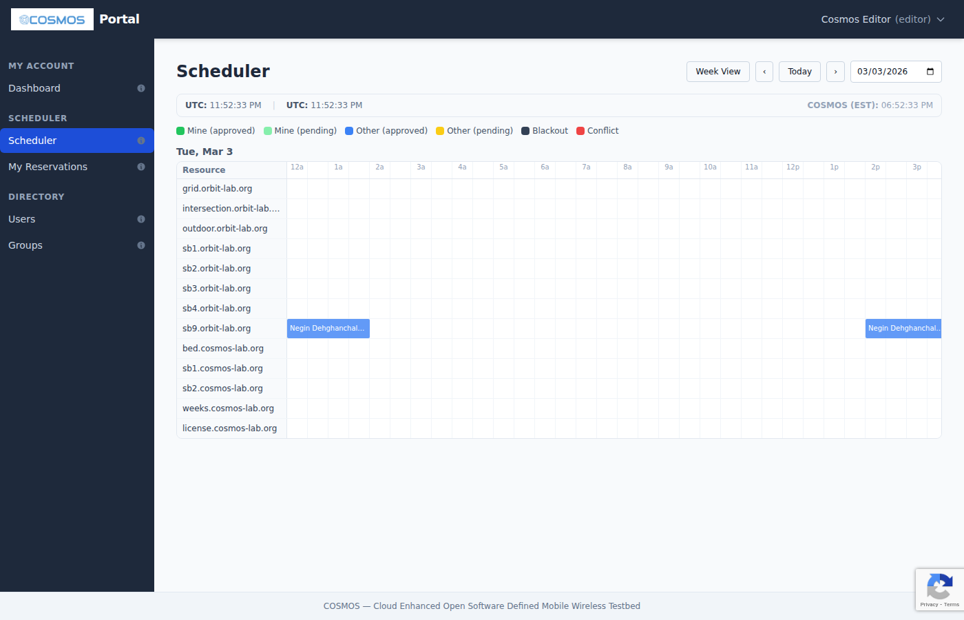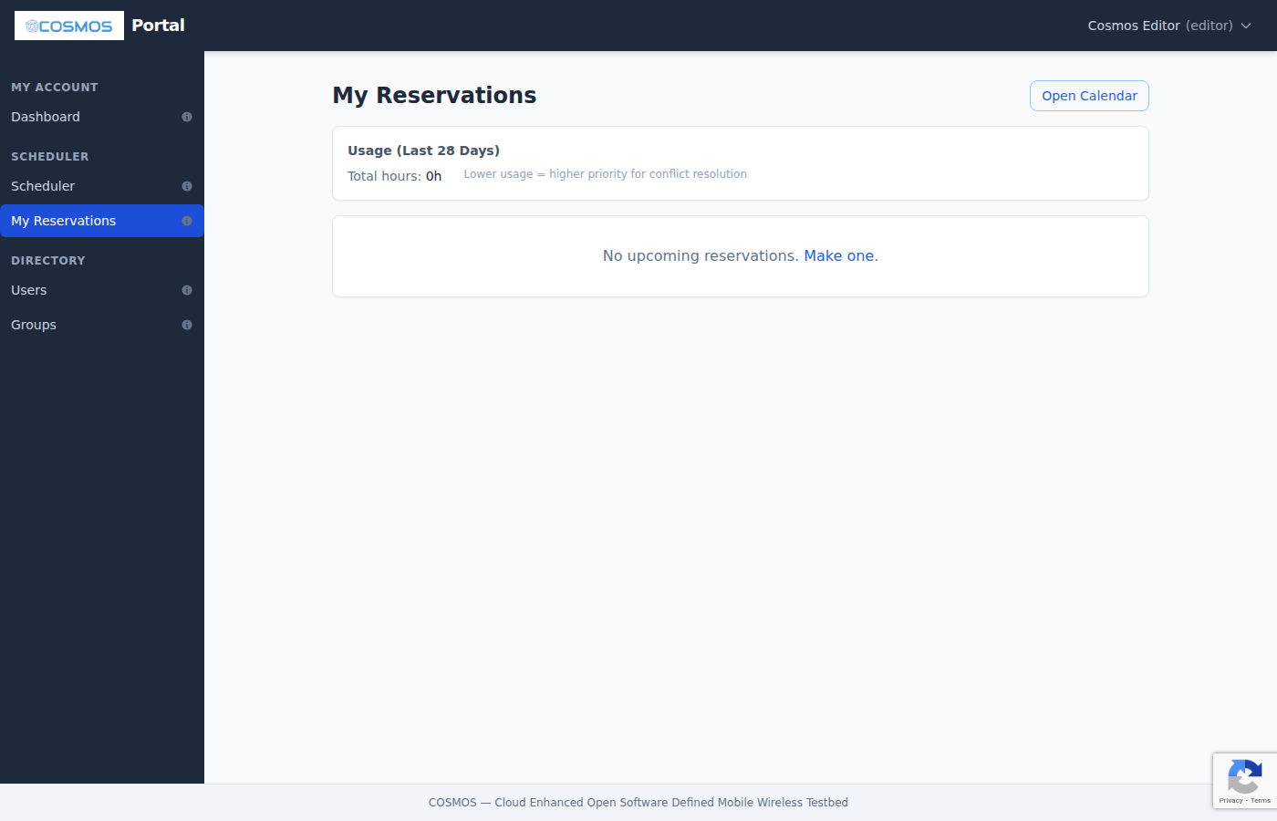 The COSMOS Portal is a web application for managing your testbed account, making reservations, and monitoring testbed resources. This guide covers the features available to regular users.